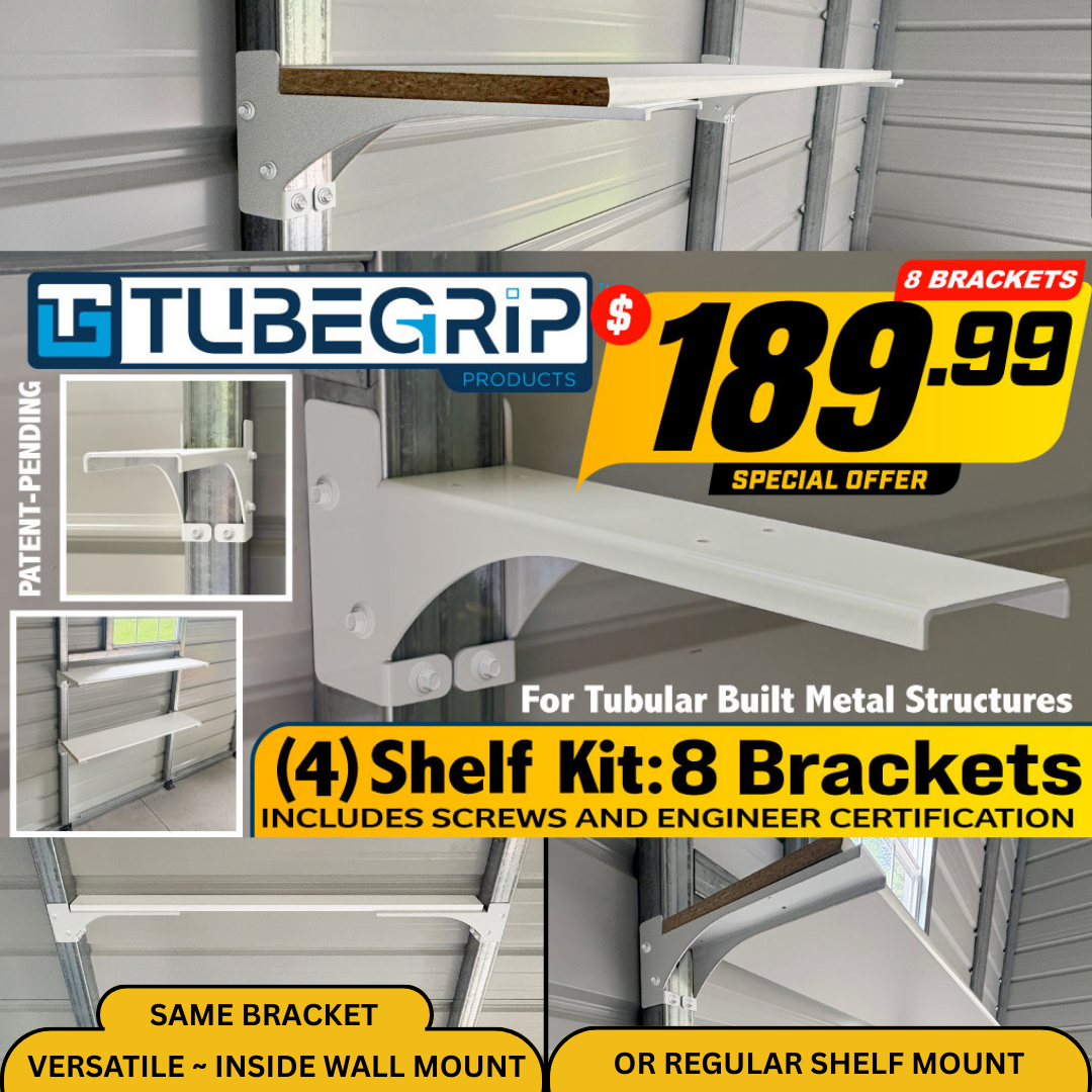 The TubeGrip™ 4-Shelf Kit delivers engineered strength and professional-grade quality for heavy-duty shelving. Each kit includes (8) 14-gauge steel shelf brackets with a durable powder-coated finish, (48) matching color screws, and an engineer-certified drawing provided by a licensed Structural Engineering Firm. Designed for high load capacity and precision alignment, TubeGrip™ brackets support up to 250 lb per shelf when fully mounted and properly installed.